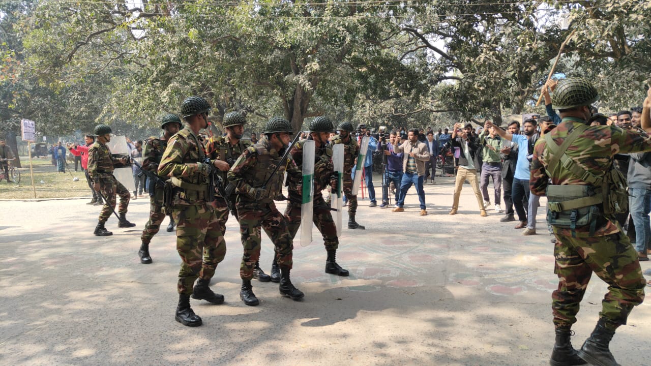 আসন্ন জাতীয় সংসদ নির্বাচনকে সামনে রেখে চাঁপাইনবাবগঞ্জে নাশকতা ও নির্বাচন বানচালের যেকোনো অপচেষ্টা প্রতিহত করতে যৌথ বাহিনীর মহড়া অনুষ্ঠিত হয়েছে। সোমবার (৯ ফেব্রুয়ারি) সকাল ১১টায় জেলা প্রশাসকের কার্যালয় সংলগ্ন কোর্ট এলাকার গুরুত্বপূর্ণ সড়ক ও জনসমাগমপূর্ণ স্থানে এ মহড়া পরিচালিত হয়।