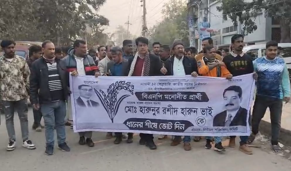 চাঁপাইনবাবগঞ্জ-৩: ধানের শীষের পক্ষে বিএনপির প্রচারণা মিছিল