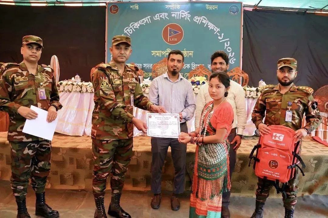 পার্বত্য চট্টগ্রামের দুর্গম অঞ্চলে জরুরি স্বাস্থ্যসেবা পৌঁছে দিতে এবং স্থানীয়দের দক্ষতা বাড়াতে ব্যতিক্রমী উদ্যোগ নিয়েছে বাংলাদেশ সেনাবাহিনী। আলীকদম জোনের ব্যবস্থাপনায় আয়োজিত ১৫ দিনব্যাপী “প্রাথমিক চিকিৎসা ও নার্সিং প্রশিক্ষণ-২০২৬” সফলভাবে সম্পন্ন হয়েছে।