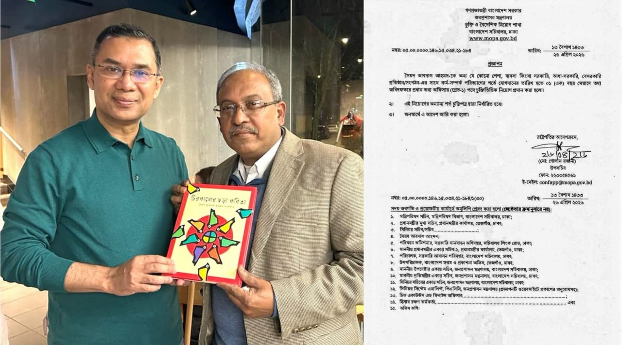 প্রজ্ঞাপনে উল্লেখ করা হয়, নিয়োগপ্রাপ্ত কর্মকর্তাকে অন্য কোনো পেশা, ব্যবসা বা সরকারি-বেসরকারি প্রতিষ্ঠানের সঙ্গে কর্ম-সম্পর্ক ত্যাগের শর্তে যোগদানের তারিখ থেকে এক বছরের জন্য এ দায়িত্ব পালন করতে হবে। জনস্বার্থে জারিকৃত এ আদেশ অবিলম্বে কার্যকর হবে বলে প্রজ্ঞাপনে জানানো হয়েছে।