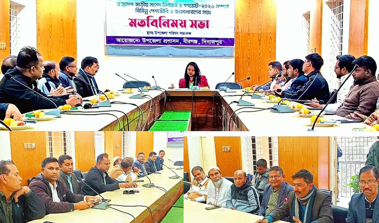 দিনাজপুরের বীরগঞ্জে আসন্ন ত্রয়োদশ জাতীয় সংসদ নির্বাচন ও গণভোট–২০২৬ উপলক্ষে সাংবাদিকদের সঙ্গে এক মতবিনিময় সভা অনুষ্ঠিত হয়েছে। বুধবার (তারিখ উল্লেখ করা যেতে পারে) বিকেল ৪টায় উপজেলা পরিষদ সভাকক্ষে উপজেলা প্রশাসনের আয়োজনে এই সভা অনুষ্ঠিত হয়। এতে সভাপতিত্ব করেন উপজেলা নির্বাহী কর্মকর্তা ও সহকারী রিটার্নিং কর্মকর্তা সুমা খাতুন।