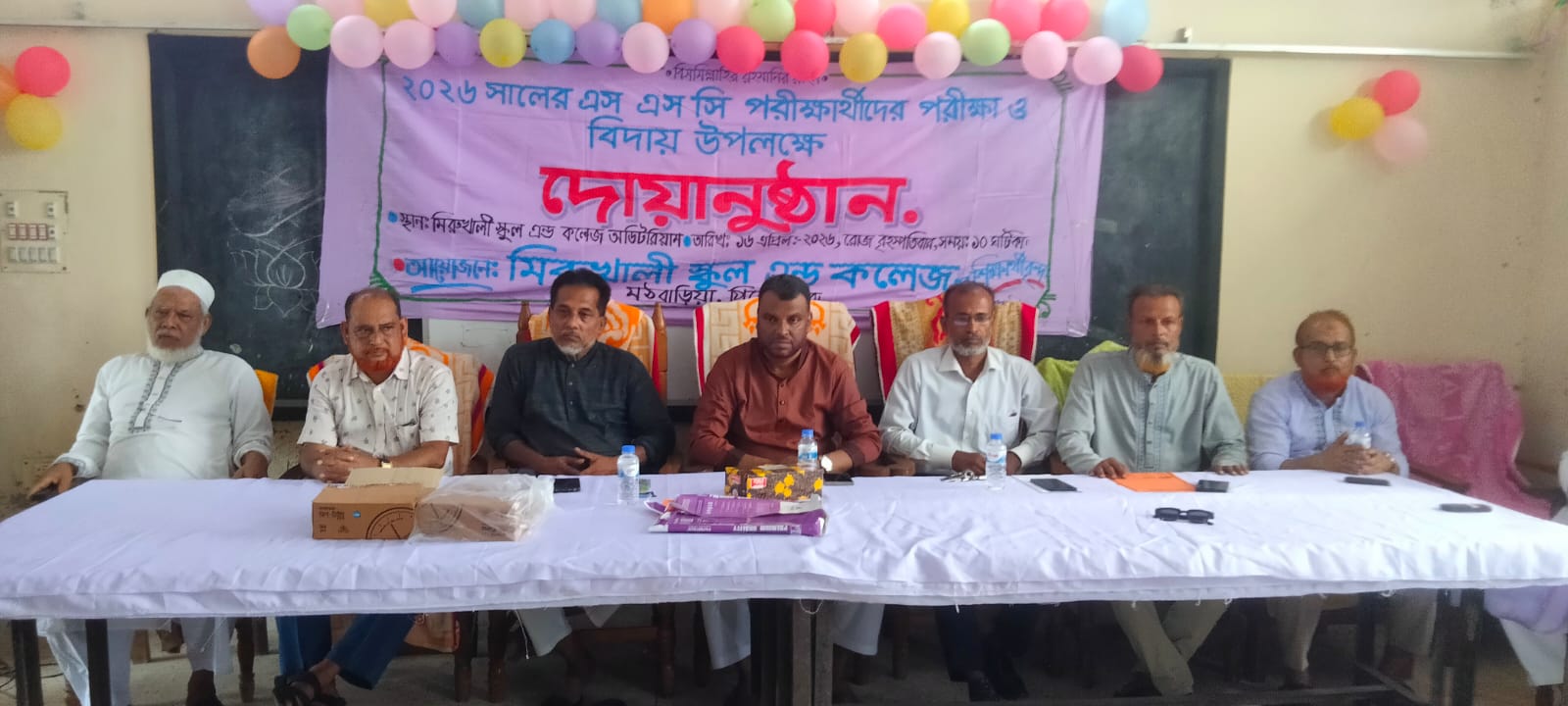 পিরোজপুরের মঠবাড়িয়া উপজেলার ঐতিহ্যবাহী শিক্ষা প্রতিষ্ঠান মিরুখালী স্কুল অ্যান্ড কলেজে ২০২৬ সালের এসএসসি পরীক্ষার্থীদের জন্য দোয়া ও বিদায় অনুষ্ঠান অনুষ্ঠিত হয়েছে। বৃহস্পতিবার (১৬ এপ্রিল ২০২৬) সকাল ১১টায় বিদ্যালয়ের মিলনায়তনে আয়োজিত এ অনুষ্ঠানে শিক্ষার্থীদের সফলতা কামনা করে দোয়া ও আন্তরিক শুভকামনা জানানো হয়।