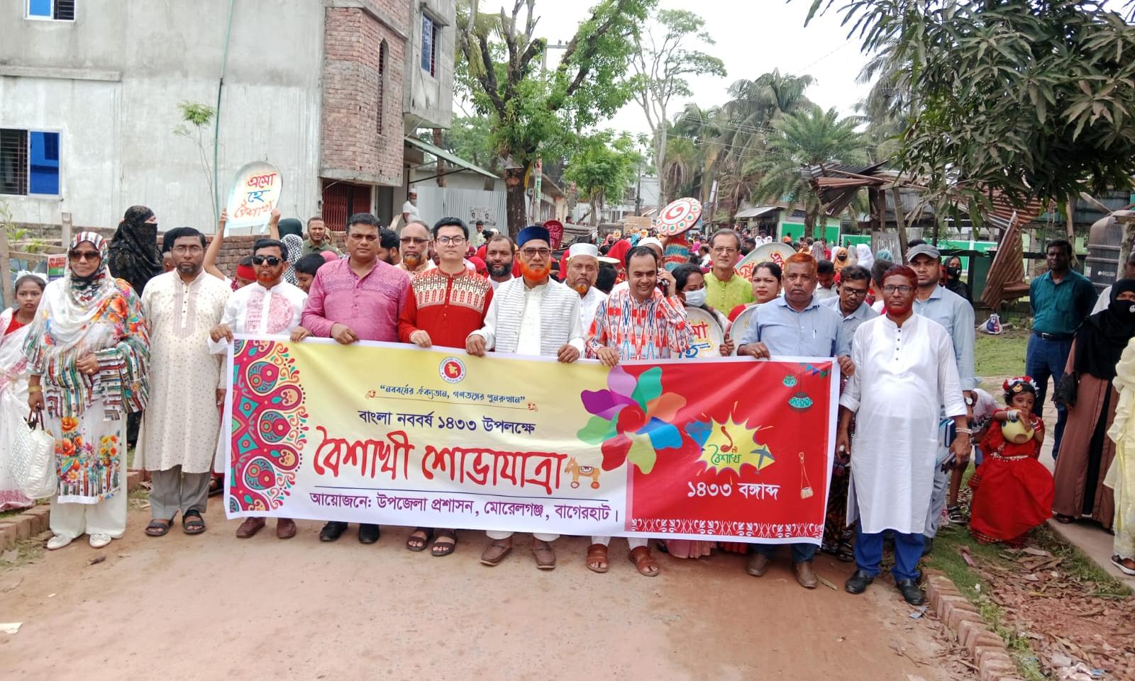 বাগেরহাটের মোরেলগঞ্জে উৎসবমুখর ও আনন্দঘন পরিবেশে বাংলা নববর্ষ ১৪৩৩ উদযাপিত হয়েছে। উপজেলা প্রশাসনের আয়োজনে বর্ণাঢ্য মঙ্গল শোভাযাত্রা, সাংস্কৃতিক অনুষ্ঠান এবং ঐতিহ্যবাহী বৈশাখী মেলার মধ্য দিয়ে বরণ করে নেওয়া হয় নতুন বছরকে।