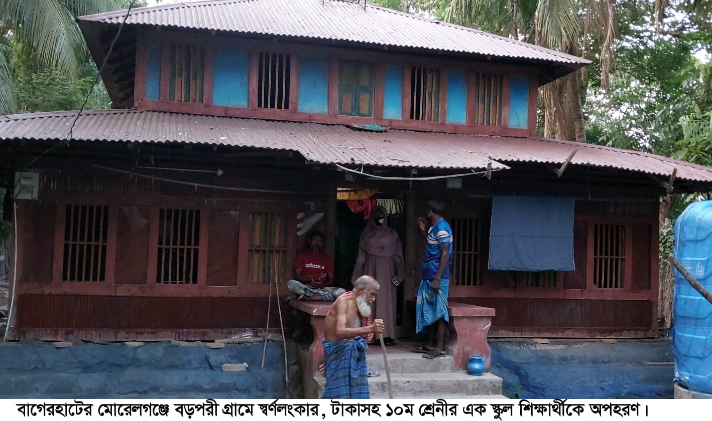 বাগেরহাটের মোরেলগঞ্জ উপজেলার বড়পরী গ্রামে স্বর্ণালংকার ও নগদ টাকাসহ দশম শ্রেণির এক শিক্ষার্থীকে অপহরণের অভিযোগ উঠেছে। এ ঘটনায় ভুক্তভোগী পরিবারের পক্ষ থেকে থানায় লিখিত অভিযোগ দায়ের করা হয়েছে এবং নিখোঁজ শিক্ষার্থীকে দ্রুত উদ্ধারসহ প্রশাসনের হস্তক্ষেপ কামনা করা হয়েছে।