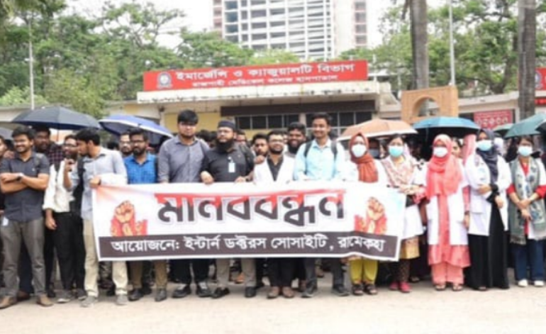 একই দাবিতে বেলা ১০টার দিকে হাসপাতালের জরুরি বিভাগের সামনে মানববন্ধন করেন তারা। পরে ইন্টার্ন চিকিৎসকরা হাসপাতাল পরিচালকের সঙ্গে সাক্ষাৎ করে তাদের দাবি তুলে ধরেন।