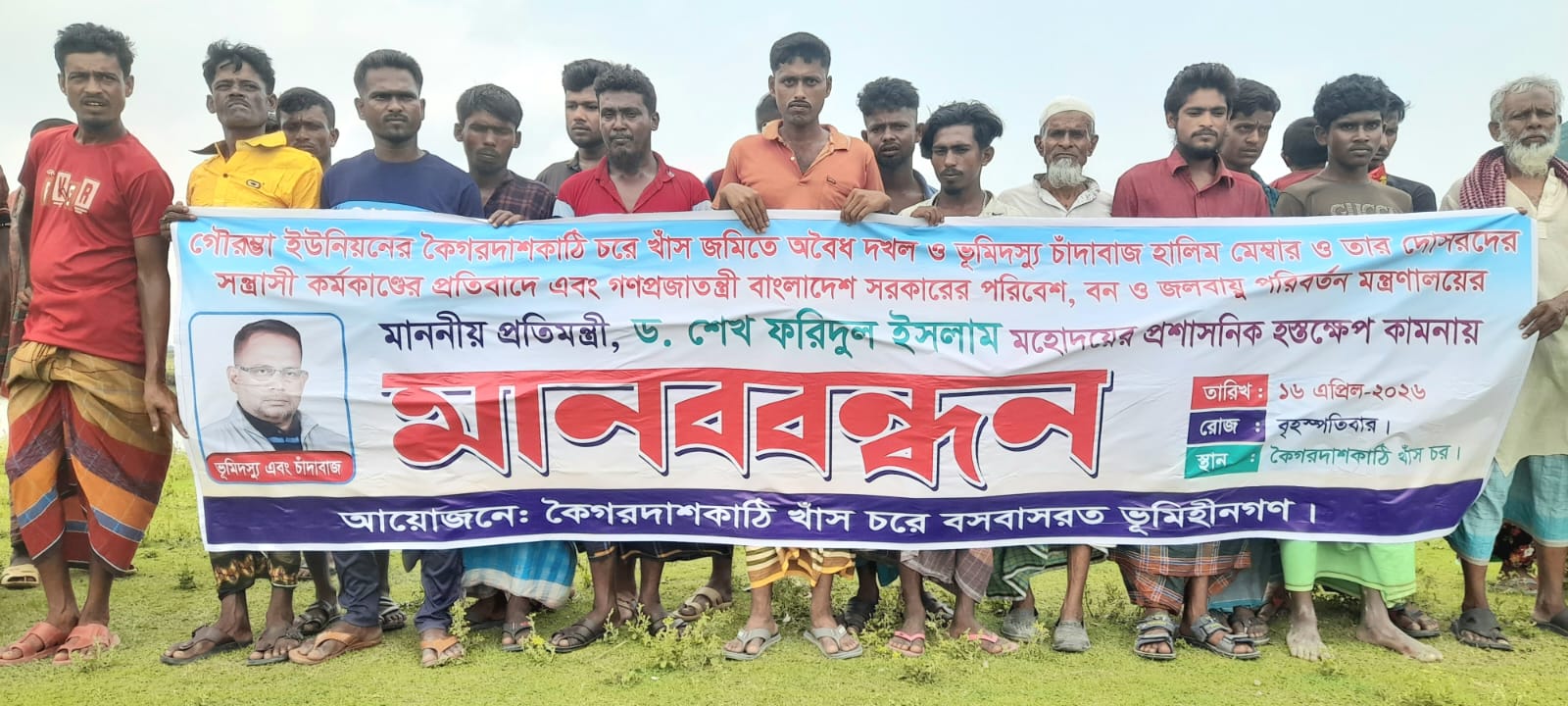 বাগেরহাটের রামপাল উপজেলার গৌরম্ভা ইউনিয়নের কৈগরদাশকাঠি চরে সরকারি খাস জমি দখল, ভূমিদস্যুতা, চাঁদাবাজি ও সন্ত্রাসী কর্মকাণ্ডের অভিযোগে মানববন্ধন অনুষ্ঠিত হয়েছে। বৃহস্পতিবার (১৬ এপ্রিল) স্থানীয় ভূমিহীন বাসিন্দাদের উদ্যোগে এ কর্মসূচি পালিত হয়। এতে খাস চরে বসবাসরত প্রায় পাঁচ শতাধিক নারী-পুরুষসহ বিভিন্ন শ্রেণি-পেশার মানুষ অংশ নেন।