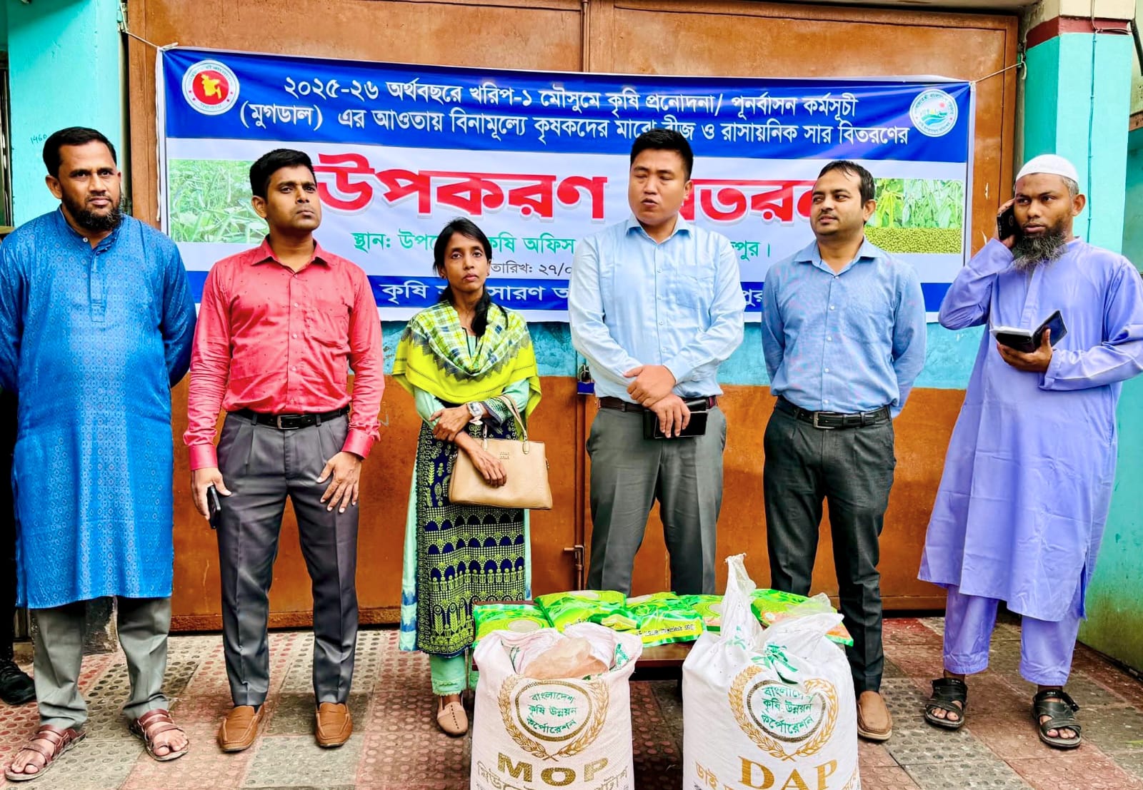 দিনাজপুরের হাকিমপুর উপজেলায় খরিপ-১ মৌসুমে কৃষি উৎপাদন বৃদ্ধির লক্ষ্যে প্রান্তিক কৃষকদের মাঝে বিনামূল্যে মুগডাল বীজ ও রাসায়নিক সার বিতরণ করা হয়েছে। ২০২৫-২৬ অর্থবছরের কৃষি প্রণোদনা কর্মসূচির আওতায় এই সহায়তা প্রদান করা হয়।