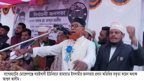 বাগেরহাটের মোরেলগঞ্জে বাংলাদেশ জামায়াতে ইসলামীর উদ্যোগে বাগেরহাট-৪ (মোরেলগঞ্জ–শরণখোলা) আসনের নির্বাচনী জনসভা অনুষ্ঠিত হয়েছে। জনসভাকে ঘিরে দলটির নেতাকর্মী ও সমর্থকদের ব্যাপক উপস্থিতি লক্ষ্য করা যায়। উপজেলা সদরস্থ আব্দুল আজিজ মেমোরিয়াল হাই…