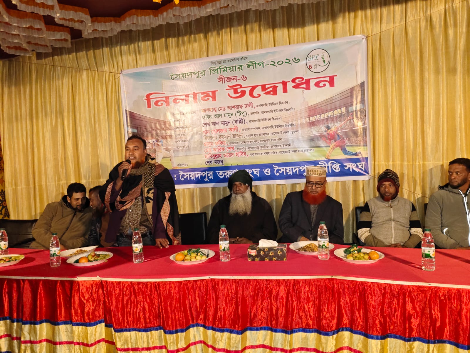 অনুষ্ঠানে সভাপতিত্ব করেন **রাখালগাছি ইউনিয়ন বিএনপির সভাপতি ফকির আল মামুন টিপু**। নিলাম অনুষ্ঠান সঞ্চালনা করেন সৈয়দপুর প্রিমিয়ার লিগ পরিচালনা কমিটির পরিচালক **মোঃ মজনু শেখ**। সভাপতির বক্তব্যে ফকির আল মামুন টিপু বলেন, “তরুণ প্রজন্মকে মাদক ও অসামাজিক কর্মকাণ্ড থেকে দূরে রেখে খেলাধুলার প্রতি আগ্রহী করে তুলতেই এই টুর্নামেন্টের আয়োজন। সৈয়দপুর প্রিমিয়ার লিগ আজ একটি ঐতিহ্যে পরিণত হয়েছে।”