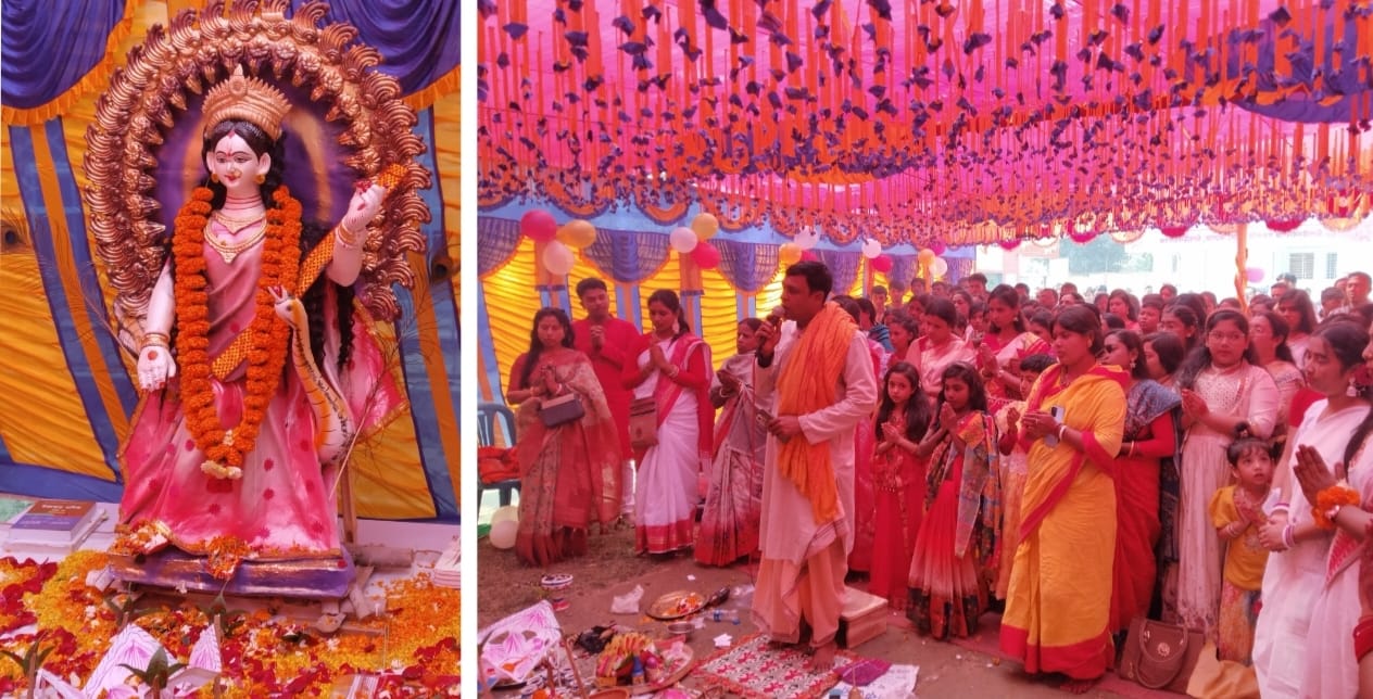 সকালে পূজার আনুষ্ঠানিকতা শুরু হয় দেবীর আরাধনা ও মন্ত্রোচ্চারণের মধ্য দিয়ে। সকাল ১১টা থেকে দুপুর ১২টা পর্যন্ত কলেজ প্রাঙ্গণে আরতি, পুষ্পাঞ্জলি ও দেবীর চরণে পুষ্পার্ঘ্য অর্পণ করেন শিক্ষার্থীসহ ভক্তরা। পরে ভক্তদের মাঝে প্রসাদ বিতরণ করা হয়। শিক্ষার্থীদের অংশগ্রহণে বাণী অর্চনা অনুষ্ঠানটি হয়ে ওঠে প্রাণবন্ত ও আনন্দঘন।