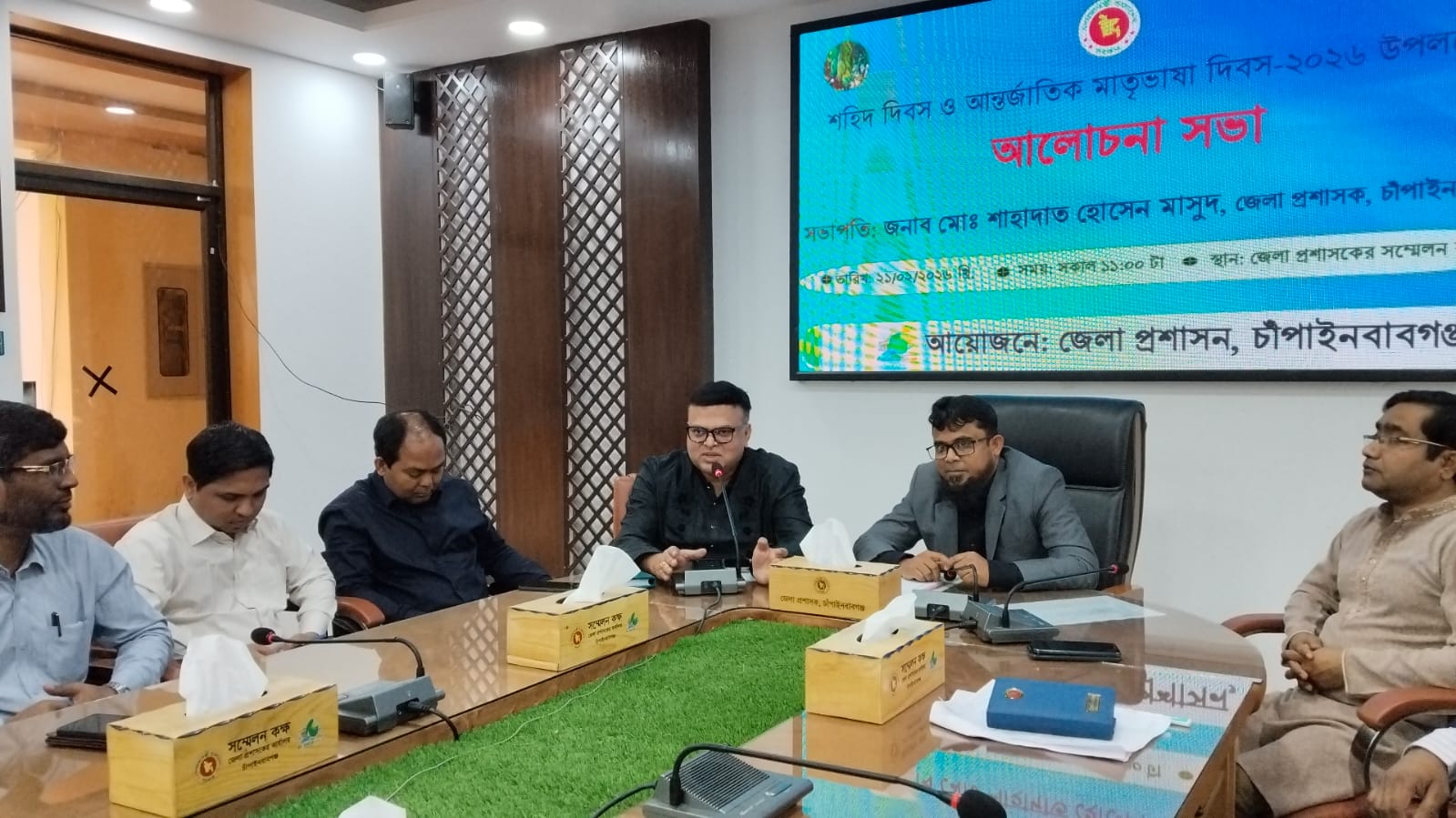 শহিদ দিবস ও আন্তর্জাতিক মাতৃভাষা দিবস-২০২৬ উপলক্ষে চাঁপাইনবাবগঞ্জে আলোচনা সভা অনুষ্ঠিত হয়েছে। চাঁপাইনবাবগঞ্জ জেলা প্রশাসনের আয়োজনে ২১ ফেব্রুয়ারি শনিবার সকাল ১১টায় জেলা প্রশাসকের সম্মেলন কক্ষে এ সভা অনুষ্ঠিত হয়।