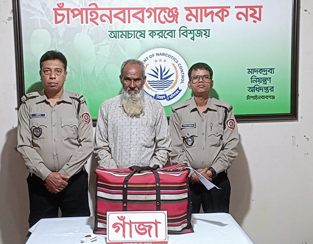 মাদকদ্রব্য নিয়ন্ত্রণ অধিদপ্তর-এর চাঁপাইনবাবগঞ্জ জেলা কার্যালয়ের উদ্যোগে পরিচালিত অভিযানে সদর মডেল থানাধীন বালিয়াডাঙ্গা ইউনিয়নের শিমুলতলা বালুচর এলাকার মৃত মাহাতাব উদ্দিনের ছেলে মো. নুরুল ইসলাম ওরফে বুধু মন্ডল (৬০) কে আটক করা হয়। অভিযান চলাকালে তার কাছ থেকে ৬ (ছয়) কেজি গাঁজা উদ্ধার করা হয়, যা তাৎক্ষণিকভাবে জব্দ তালিকাভুক্ত করা হয়েছে।