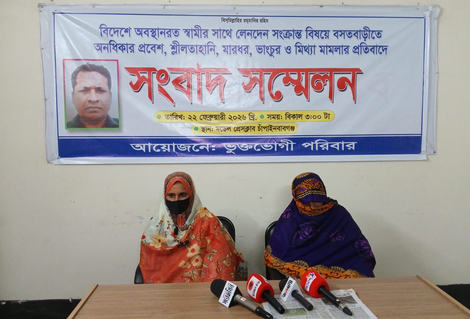 রোববার (২২ ফেব্রুয়ারি) বিকেল ৩টায় মডেল প্রেসক্লাব চাঁপাইনবাবগঞ্জ-এর হলরুমে আয়োজিত সংবাদ সম্মেলনে লিখিত বক্তব্য পাঠ করেন তিনি। মর্জিনা খাতুন পৌর এলাকার পোলাডাঙ্গা গ্রামের মো. তহুরুলের স্ত্রী।