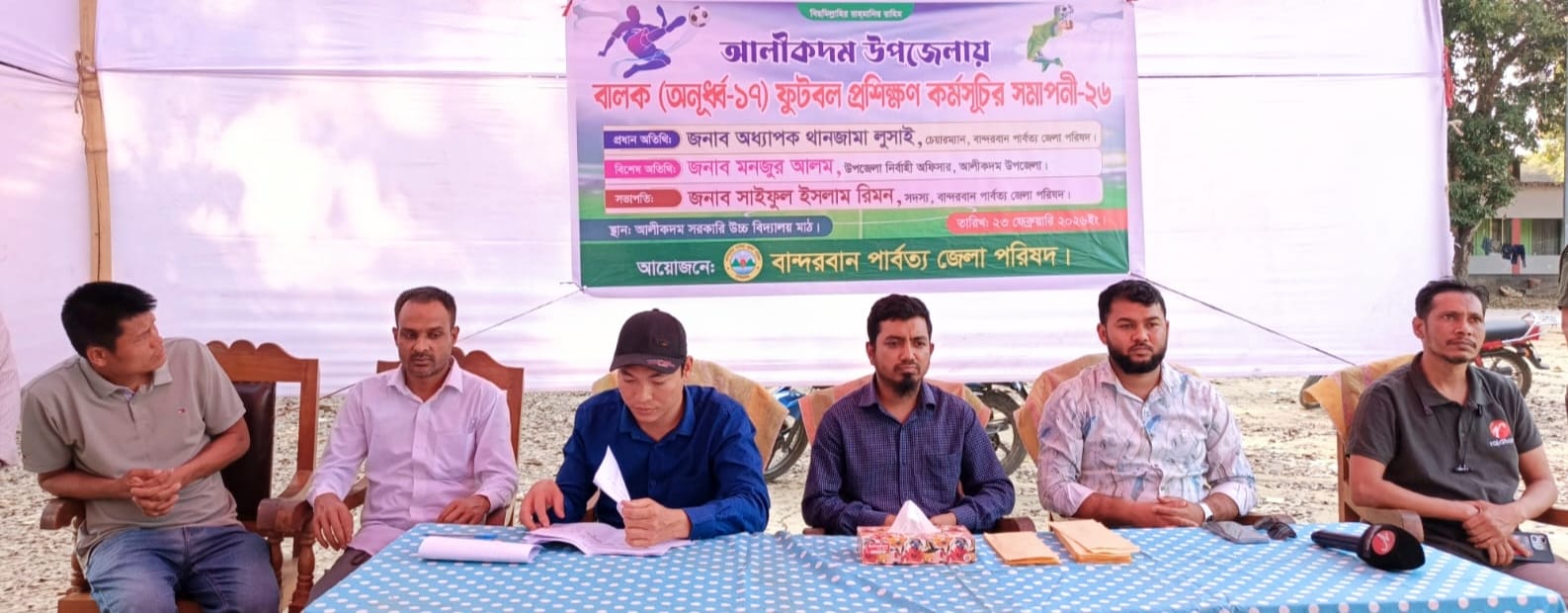 বান্দরবানের আলীকদম উপজেলায় তরুণ ক্রীড়াবিদদের অংশগ্রহণে অনূর্ধ্ব-১৭ বালক ফুটবল প্রশিক্ষণ কর্মসূচির সমাপনী অনুষ্ঠান অনুষ্ঠিত হয়েছে। বান্দরবান পার্বত্য জেলা পরিষদ-এর উদ্যোগে আয়োজিত ১০ দিনব্যাপী এই প্রশিক্ষণ কার্যক্রম স্থানীয় ক্রীড়াঙ্গনে নতুন সম্ভাবনার দ্বার উন্মোচন করেছে।