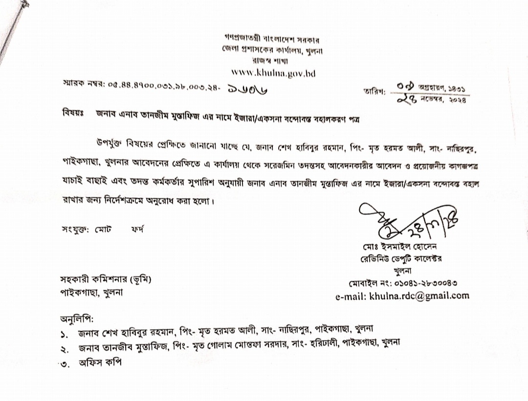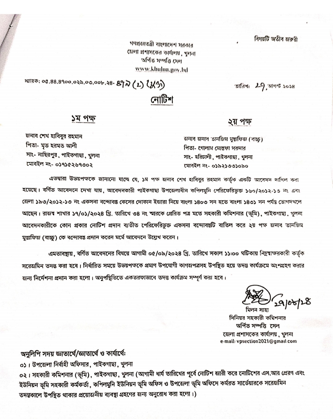গত ১৪/০৮/২০২৪ তারিখে সার্ভেয়ারকে ভুল বুঝিয়ে শেখ হাবিবুর রহমানের নামে একটি ডিসিআর কাটে। বিষয়টি জানতে পেরে ১৫/০৮/২০২৪ তারিখে অভিযোগ দিলে এসি ল্যান্ড মহোদয় তাৎক্ষণিক শেখ হাবিবুর রহমানের ডিসিআরটি বাতিল করে দেয়। এরপর শেখ হাবিবুর রহমান বাদী হয়ে ডিসি মহোদয়ের কাছে একটি অভিযোগ দায়ের করে। ০৫/০৯/২০২৪ তারিখে এডিসি রেভিনিউ উক্ত অভিযোগটি সরেজমিনে তদন্ত করে ২৪/১১/২০২৪ তারিখে আমাদের পক্ষে একটা আদেশ দেন।গত ২২/০২/২০২৬ তারিখে ঘরের তালা ভেঙে ঘরটি জবরদখল করে। আমরা উপজেলা নির্বাহী অফিসারের কাছে লিখিত অভিযোগ দিলে উনি ওসি সাহেবকে ফরোয়ার্ড করেন।