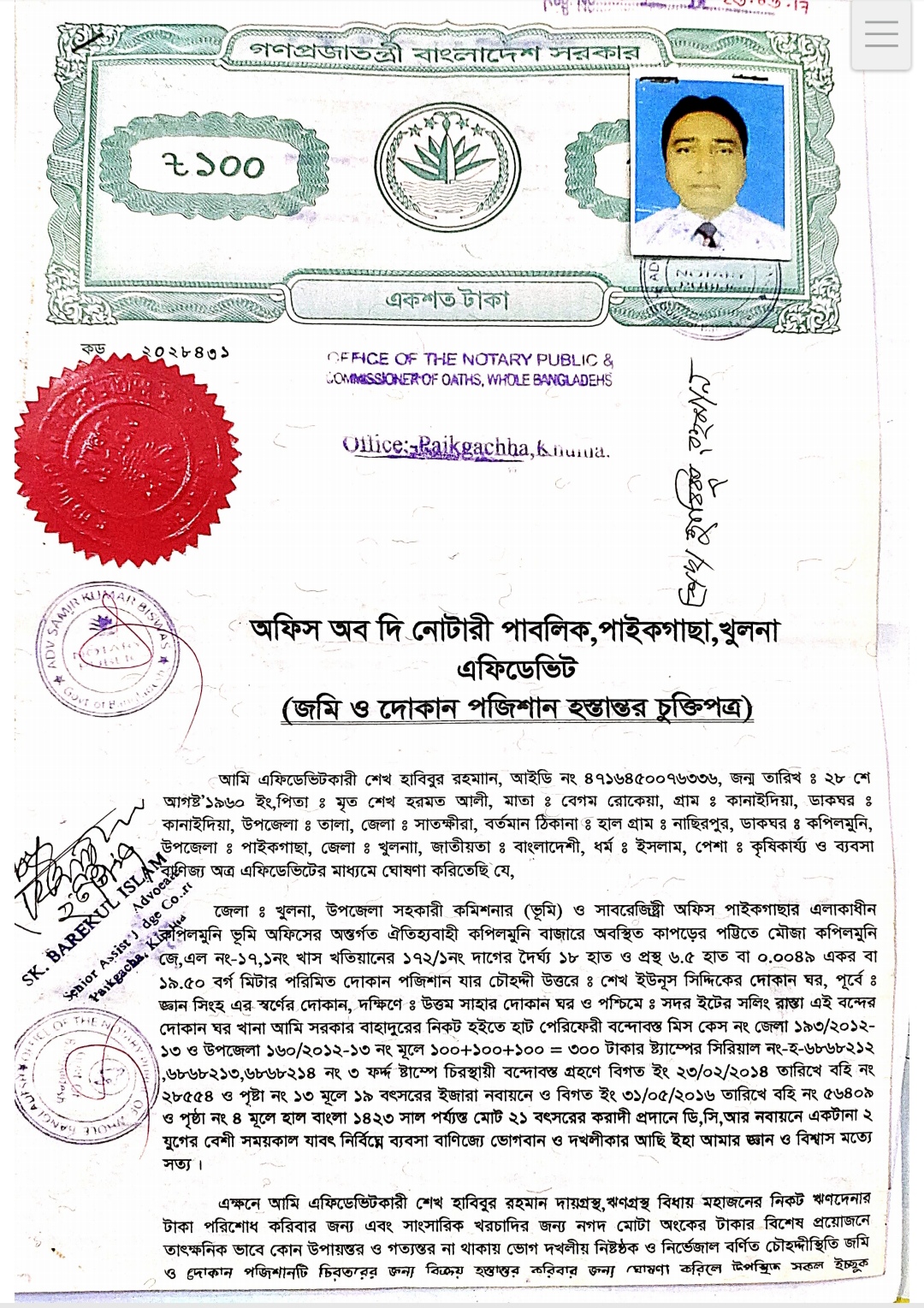 খুলনার কপিলমুনিতে জোরপূর্বক দোকান ঘর দখলের অভিযোগ উঠেছে। মোঃ গোলাম মোস্তফা পিতা- মৃত আবুল তাহের সরদার গ্রাম- হরিঢালী পাইকগাছা খুলনা গত ২৩/০৩/২০১৭ তারিখে ৩০০/- টাকার স্ট্যাম্পের মাধ্যমে শেখ হাবিবুর রহমান পিতা- মৃত শেখ হরমত আলী গ্রাম-কানাইদিয়া তালা সাতক্ষীরা এর নিকট হতে লিখিত নগদ দশ লক্ষ টাকার বিনিময়ে কপিলমুনি বাজারে কাপড়ের পট্টিতে কপিলমুনি মৌজায় জেএল নং ১৭, ১ নং খাস খতিয়ানের ১৭২/১ নং দাগের হাট পেরিফেরী বন্দোবস্ত মিস কেস নং জেলা ১৯৩/২০১২-১৩ ও উপজেলা ১৬০/২০১২-৩ নং ( ১৯.৫০ বর্গ মিটার ) দোকান ঘরটি ক্রয় সূত্রে মেসার্স সরদার বস্ত্রালয় নামে অদ্যাবধি ভোগদখল করে আসছে।