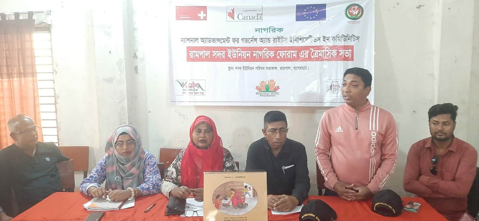 রামপাল উপজেলার রামপাল সদর ইউনিয়ন নাগরিক ফোরামের তৃতীয় ত্রৈমাসিক সভা অনুষ্ঠিত হয়েছে। সোমবার (২ মার্চ ২০২৬) সকাল সাড়ে ১০টায় রামপাল সদর ইউনিয়ন পরিষদের হলরুমে আয়োজিত এ সভায় স্থানীয় নাগরিক সমাজের প্রতিনিধিরা অংশগ্রহণ করেন। সভায় নারী অধিকার, সামাজিক বৈষম্য, পারিবারিক সহিংসতা এবং সামাজিক নিরাপত্তা কর্মসূচি বিষয়ে গুরুত্বপূর্ণ আলোচনা অনুষ্ঠিত হয়।