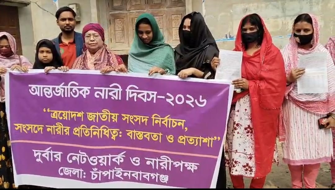 আন্তর্জাতিক নারী দিবস–২০২৬ উপলক্ষে নারীর নাগরিক মর্যাদা, সমঅধিকার ও বৈষম্যহীন সমাজ প্রতিষ্ঠার দাবিতে চাঁপাইনবাবগঞ্জে মানববন্ধন অনুষ্ঠিত হয়েছে। নারীর প্রতি বৈষম্য ও অমানবিক আচরণের প্রতিবাদ জানিয়ে এ মানববন্ধনে অংশগ্রহণকারীরা একটি ন্যায়ভিত্তিক ও মানবিক রাষ্ট্র গঠনের আহ্বান জানান।
