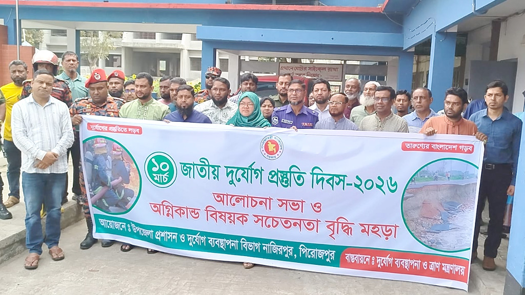 ‘দুর্যোগ প্রস্তুতিতে লড়ব, তারুণ্যের বাংলাদেশ গড়ব’ এই প্রতিপাদ্যকে সামনে রেখে পিরোজপুরের নাজিরপুরে জাতীয় দুর্যোগ প্রস্তুতি দিবস উদযাপন করা হয়েছে। মঙ্গলবার (১০ মার্চ) সকালে উপজেলা প্রশাসন ও দুর্যোগ ব্যবস্থাপনা শাখার উদ্যোগে বর্ণাঢ্য র্যালি, আলোচনা সভা ও অগ্নিনির্বাপণ মহড়া অনুষ্ঠিত হয়।