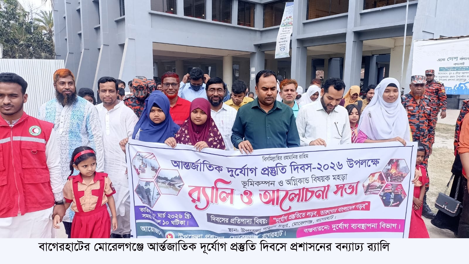 বাগেরহাটের মোরেলগঞ্জ উপজেলায় “দুর্যোগ প্রস্তুতিতে লড়ব, তারুণ্যে বাংলাদেশ গড়ব” প্রতিপাদ্যকে সামনে রেখে আন্তর্জাতিক দুর্যোগ প্রস্তুতি দিবস–২০২৬ উপলক্ষে বর্ণাঢ্য র্যালি, আলোচনা সভা ও মহড়া অনুষ্ঠিত হয়েছে।