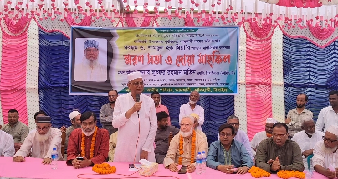 টাঙ্গাইলের কালিহাতী উপজেলায় বিশিষ্ট ব্যক্তিত্ব মরহুম ড. শামছুল হক মিয়ার আত্মার মাগফিরাত কামনায় এক স্মরণসভা ও দোয়া মাহফিল গভীর শ্রদ্ধা ও ধর্মীয় ভাবগাম্ভীর্যের মধ্য দিয়ে অনুষ্ঠিত হয়েছে। পবিত্র আল-কুরআনের চিরন্তন বাণী—“প্রত্যেক প্রাণীকে মৃত্যুর স্বাদ গ্রহণ করতে হবে”—এই উপলব্ধিকে সামনে রেখে আয়োজিত এ অনুষ্ঠানটি স্থানীয় মানুষের মাঝে আবেগঘন পরিবেশ সৃষ্টি করে।