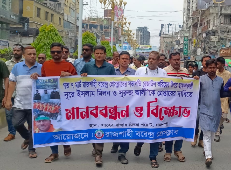 রাজশাহীতে বরেন্দ্র প্রেসক্লাবের সভাপতি রেজাউল করিমের ওপর সশস্ত্র হামলার প্রতিবাদে মানববন্ধন ও বিক্ষোভ কর্মসূচি অনুষ্ঠিত হয়েছে। হামলার ঘটনায় জড়িতদের দ্রুত গ্রেপ্তার ও দৃষ্টান্তমূলক শাস্তির দাবিতে সাংবাদিক নেতারা তীব্র ক্ষোভ প্রকাশ করেছেন।
