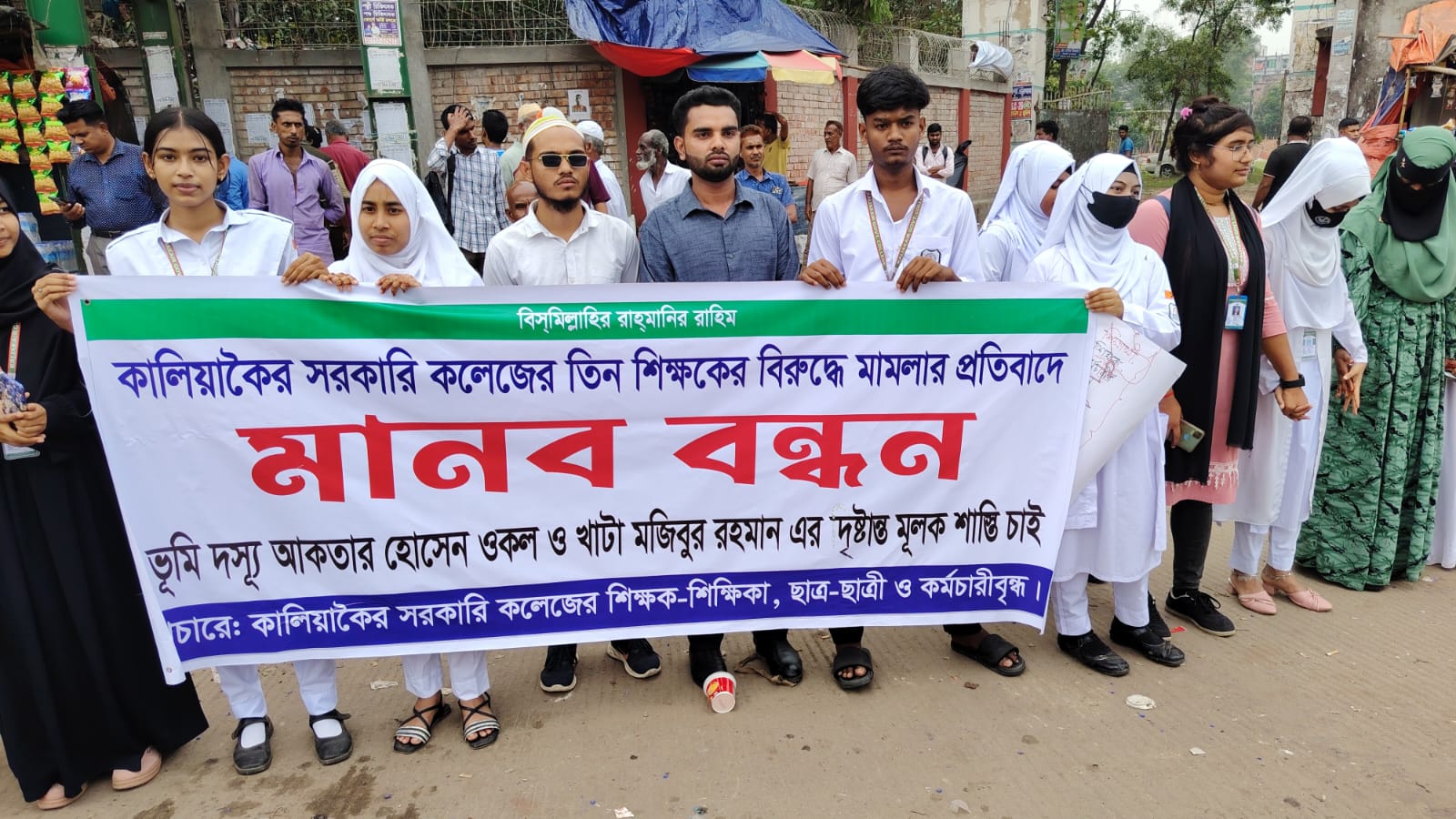 মানববন্ধনে অংশগ্রহণকারীরা অভিযোগ করেন, সম্প্রতি কলেজের আওতাধীন একটি জমিতে মসজিদ নির্মাণের উদ্যোগ নেয় কলেজ কর্তৃপক্ষ। তবে স্থানীয়ভাবে ভূমিদস্যু হিসেবে পরিচিত আকতার হোসেন ওকল এবং খাটা মজিবুর রহমান ওই জমির মালিকানা দাবি করে নির্মাণকাজে বাধা দেন। একপর্যায়ে তারা আদালতে গিয়ে কলেজের তিনজন শিক্ষকের বিরুদ্ধে মামলা দায়ের করেন, যা শিক্ষক-শিক্ষার্থী মহলে ব্যাপক প্রতিক্রিয়ার সৃষ্টি করেছে।
