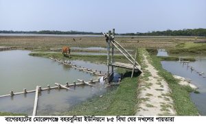 বাগেরহাটের মোরেলগঞ্জে ৮৫ বিঘার একটি মৎস্যঘের দখলের অভিযোগে উত্তেজনা দেখা দিয়েছে। স্থানীয় জমির মালিকদের দাবি, রাজনৈতিক প্রভাব ও পেশীশক্তি ব্যবহার করে একটি প্রভাবশালী মহল আবারও ঘেরটি দখলের চেষ্টা করছে। এর প্রতিবাদে মানববন্ধন করেছেন ক্ষতিগ্রস্তরা।