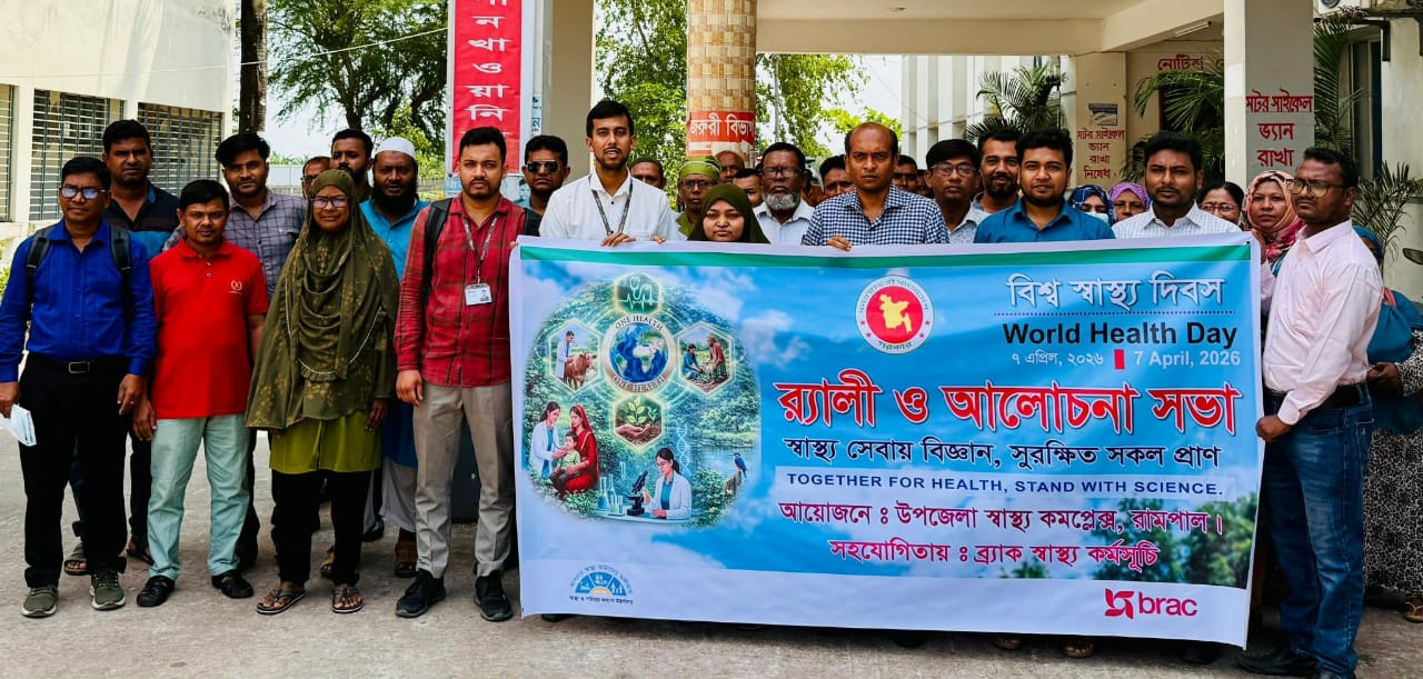 রামপাল-এ স্বাস্থ্য সেবায় বিজ্ঞান ও সচেতনতার গুরুত্ব নিয়ে বিশ্ব স্বাস্থ্য দিবস পালিত হয়েছে। “স্বাস্থ্য সেবায় বিজ্ঞান, সুরক্ষিত সকল প্রাণ” প্রতিপাদ্যকে সামনে রেখে মঙ্গলবার (৭ এপ্রিল) সকাল থেকে বিভিন্ন কর্মসূচির মাধ্যমে দিবসটি উদযাপন করা হয়।