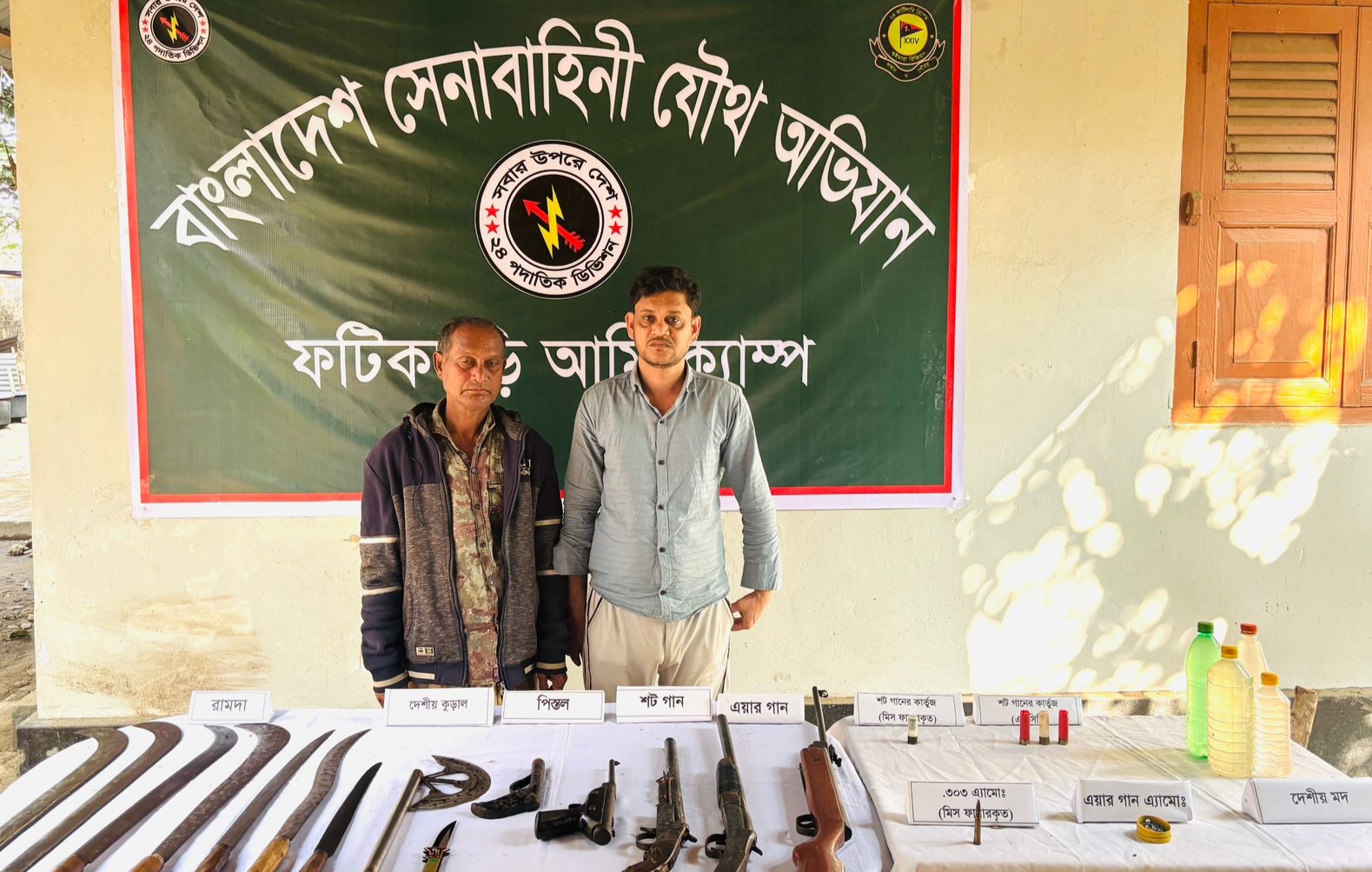 চট্টগ্রামের ফটিকছড়ি উপজেলায় বাংলাদেশ সেনাবাহিনীর একটি সফল বিশেষ অভিযানে বিপুল পরিমাণ অস্ত্র ও দেশীয় মদসহ দুই সশস্ত্র সন্ত্রাসীকে আটক করা হয়েছে। পার্বত্য চট্টগ্রাম ও আশপাশের অঞ্চলে শান্তি ও নিরাপত্তা নিশ্চিত করার লক্ষ্যে নিয়মিত অভিযানের অংশ হিসেবে এই অভিযান পরিচালিত হয় বলে জানিয়েছে সংশ্লিষ্ট সূত্র।
