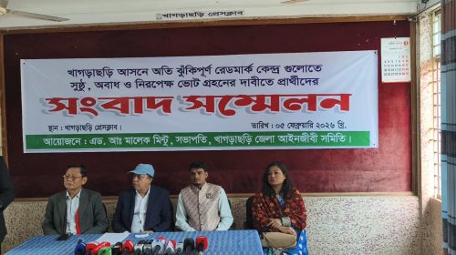 খাগড়াছড়ি সংসদীয় আসনের ঝুঁকিপূর্ণ ও অতি ঝুঁকিপূর্ণ (রেডমার্ক) ভোটকেন্দ্রগুলোতে অবাধ, সুষ্ঠু ও নিরপেক্ষ নির্বাচন নিশ্চিতের দাবিতে সংবাদ সম্মেলন করেছেন বিভিন্ন রাজনৈতিক দলের প্রার্থীরা। আসন্ন জাতীয় সংসদ নির্বাচনকে কেন্দ্র করে পাহাড়ি…