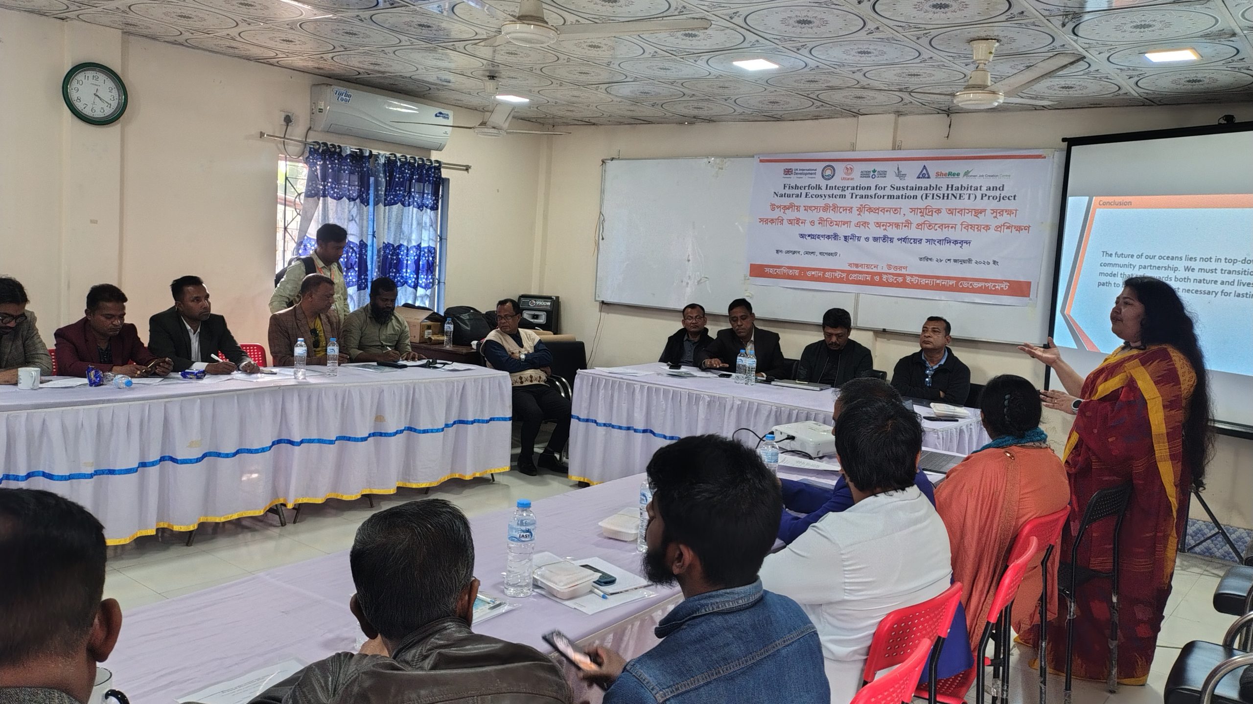 মোংলায় উপকূলীয় মৎস্যজীবীদের ঝুঁকিপ্রবনতা, সামুদ্রিক আবাসস্থল সুরক্ষা সরকারি আইন ও নীতিমালা এবং অনুসন্ধানী প্রতিবেদন বিষয়ক স্থানীয় ও জাতীয় পর্যায়ের সাংবাদিকদের নিয়ে প্রশিক্ষণ কর্মশালা অনুষ্ঠিত হয়েছে। ​উপকূলীয় অঞ্চলে কর্মরত সাংবাদিকদের অনুসন্ধানী প্রতিবেদন তৈরিতে দক্ষ করে তোলাই ছিল এই আয়োজনের মূল লক্ষ্য।