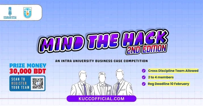 খুলনা বিশ্ববিদ্যালয়ে (খুবি) দ্বিতীয়বারের মতো অনুষ্ঠিত হতে যাচ্ছে আন্তঃবিশ্ববিদ্যালয় বিজনেস কেস প্রতিযোগিতা “Mind the Hack”। খুবি ক্যারিয়ার ক্লাবের উদ্যোগে আয়োজিত এই প্রতিযোগিতা শিক্ষার্থীদের বাস্তবমুখী চিন্তাভাবনা, বিশ্লেষণী দক্ষতা ও কৌশলগত সমস্যা সমাধানের সক্ষমতা বিকাশে গুরুত্বপূর্ণ ভূমিকা রাখবে বলে আয়োজকরা আশা প্রকাশ করেছেন।