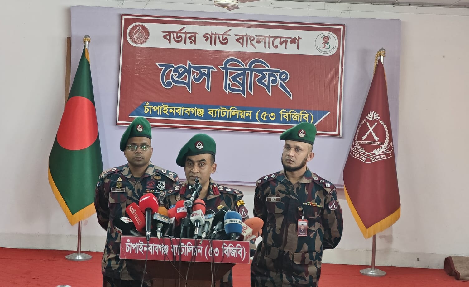 এ উপলক্ষে রবিবার (২৫ জানুয়ারি) বিকাল সাড়ে ৩টায় চাঁপাইনবাবগঞ্জ জেলার মাল্টিপারপাস শেডে এক সংবাদ সম্মেলনের আয়োজন করে চাঁপাইনবাবগঞ্জ ব্যাটালিয়ন (৫৩ বিজিবি)। সংবাদ সম্মেলনে বক্তব্য দেন ব্যাটালিয়নের অধিনায়ক লেফটেন্যান্ট কর্নেল কাজী মুস্তাফিজুর রহমান, পিএসসি।