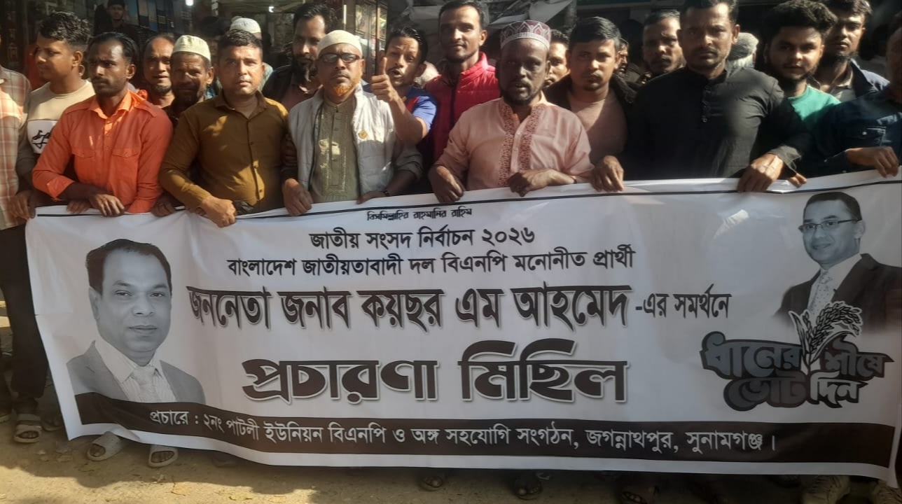 ত্রয়োদশ জাতীয় সংসদ নির্বাচনের আনুষ্ঠানিক প্রচারণা শুরু হওয়ার সঙ্গে সঙ্গে জগন্নাথপুর উপজেলার পাটলী ইউনিয়নের রসুলগঞ্জ বাজারে বাংলাদেশ জাতীয়তাবাদী দল (বিএনপি) অঙ্গ ও সহযোগী সংগঠনের নেতাকর্মীদের অংশগ্রহণে উৎসবমুখর নির্বাচনী মিছিল অনুষ্ঠিত হয়েছে। সহস্রাধিক ভোটার ও নেতা-কর্মী এ মিছিলে অংশ নিয়ে প্রচারণাকে আরও প্রভাবশালী করেছে।