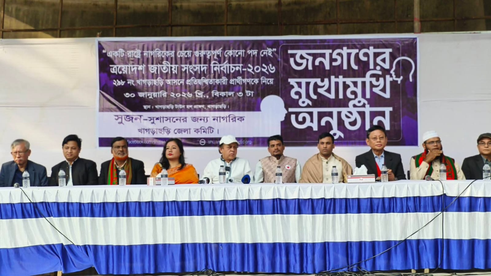 খাগড়াছড়িতে ত্রয়োদশ জাতীয় সংসদ নির্বাচনের প্রার্থীদের অংশগ্রহণে অনুষ্ঠিত হলো ব্যতিক্রমী নাগরিক সংলাপ ‘জনগণের মুখোমুখি’। শুক্রবার (৩০ জানুয়ারি) বিকাল ৩টায় খাগড়াছড়ি টাউন হল প্রাঙ্গণে সুজন—সুশাসনের জন্য নাগরিক, খাগড়াছড়ি জেলা কমিটির উদ্যোগে আয়োজিত এই অনুষ্ঠানে প্রার্থীরা সরাসরি নাগরিকদের প্রশ্নের উত্তর দেন এবং নির্বাচনী অঙ্গীকার তুলে ধরেন।