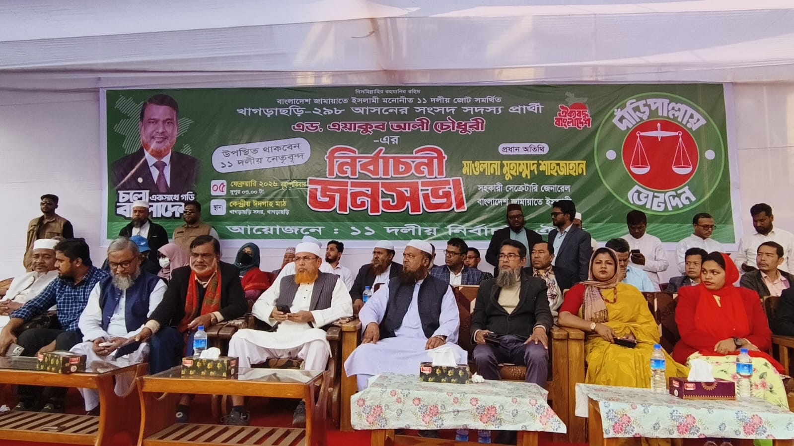 আসন্ন জাতীয় সংসদ নির্বাচনের প্রাক্কালে খাগড়াছড়িতে ১১ দলীয় জোটের আয়োজিত জনসভায় দুর্নীতি, চাঁদাবাজি ও জমি দখলবাজির বিরুদ্ধে ভোট দেওয়ার আহ্বান জানানো হয়েছে। বৃহস্পতিবার (৫ ফেব্রুয়ারি ২০২৬) বিকেলে খাগড়াছড়ি ঈদগাঁ মাঠে অনুষ্ঠিত জনসভায় প্রধান অতিথি হিসেবে বক্তব্য দেন বাংলাদেশ জামায়াতে ইসলামীর সহকারী সেক্রেটারি জেনারেল মাওলানা মুহাম্মদ শাহজাহান।