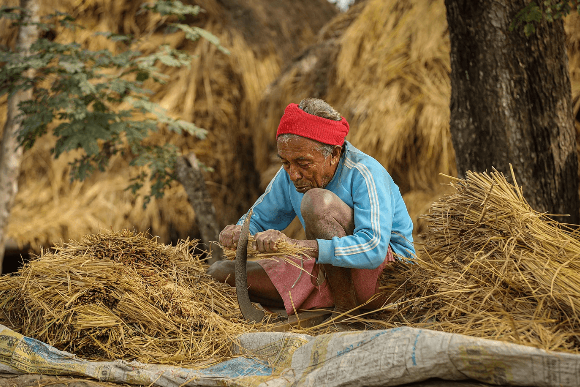 গবাদিপশুকে খাওয়ানোর জন্য খড় কাটছেন তিনি।