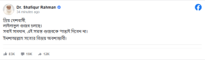 ত্রয়োদশ জাতীয় সংসদ নির্বাচনের প্রাক্কালে দেশের মানুষকে সামাজিক মাধ্যমে ছড়ানো গুজব থেকে সতর্ক থাকার আহ্বান জানিয়েছেন বাংলাদেশ জামায়তে ইসলামীর আমির ডা. শফিকুর রহমান। বুধবার (১১ ফেব্রুয়ারি) নিজের ভেরিফায়েড ফেসবুক পেজে তিনি লিখেন, “লাইলাতুল গুজব চলছে। সবাই সাবধান, এই সমস্ত গুজবকে পাত্তাই দিবেন না। ইনশাআল্লাহ সত্যের বিজয় অবশ্যম্ভাবী।”