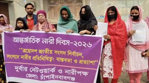 আন্তর্জাতিক নারী দিবস–২০২৬ উপলক্ষে নারীর নাগরিক মর্যাদা, সমঅধিকার ও বৈষম্যহীন সমাজ প্রতিষ্ঠার দাবিতে চাঁপাইনবাবগঞ্জে মানববন্ধন অনুষ্ঠিত হয়েছে। নারীর প্রতি বৈষম্য ও অমানবিক আচরণের প্রতিবাদ জানিয়ে এ মানববন্ধনে অংশগ্রহণকারীরা একটি ন্যায়ভিত্তিক…