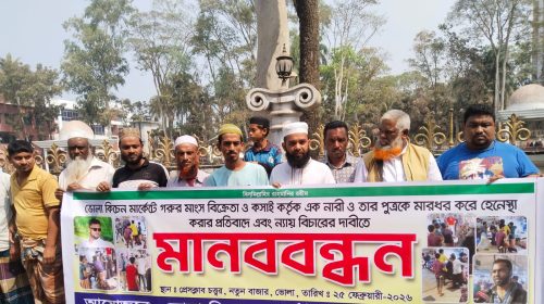 ভোলার কিচেন মার্কেটে এক নারী ও তার পুত্রকে মারধর ও হেনস্থার অভিযোগে অভিযুক্ত এক গরুর মাংস বিক্রেতার শাস্তির দাবিতে মানববন্ধন করেছেন স্থানীয় ব্যবসায়ীরা। বুধবার (২৫ ফেব্রুয়ারি) সকাল ১১টায় ভোলা প্রেসক্লাব-এর…